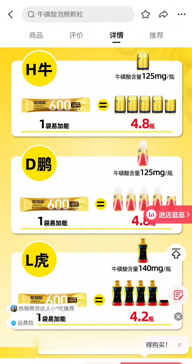 易加能是一种牛磺酸泡腾类产品,冲泡后即饮。目前电商平台销售的易加能主要为颗粒状,每条易加能规格为4g,12条装易加能售价为45元左右。在其旗舰店广告中,该品牌称1条易加能牛磺酸含量约合4.8瓶H牛或4.2瓶L虎。